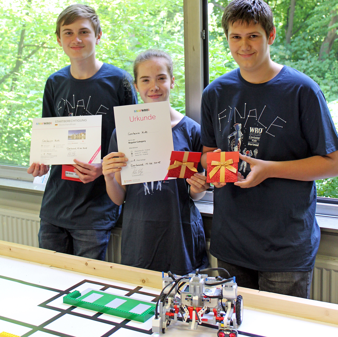Die zahlreichen Trainingsstunden der »Container Kids« der Geschwister Scholl Gesamtschule (GSG) haben sich ausgezahlt. Die drei Teammitglieder aus der siebten und achten Klasse haben sich beim regionalen Vorentscheid gegen zahlreiche Dortmunder Mannschaften durchgesetzt und sich somit für das Deutschlandfinale der World Robot Olympiad (WRO) 2018 qualifiziert. Unterstützt wurden Sie dabei von Team-Coach und Mentorin Frau Hönekopp.